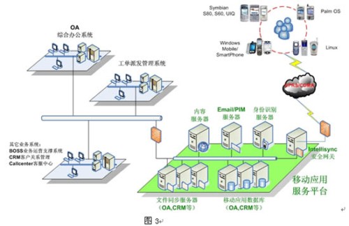 用戶(hù)通過(guò)智能手持終端訪問(wèn)應(yīng)用,平臺(tái)支持采用Symbian、SmartPhone、PocketPC和Palm操作系統(tǒng)的終端,還支持SyncML、brew、java、Windows PC的應(yīng)用。