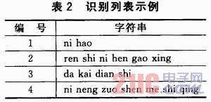 、趯懭胱R別列表。列表的規(guī)則是,每個識別條目對應(yīng)一個特定的編號(1個字節(jié)),編號可以相同,可以不連續(xù),但是數(shù)值要小于256(00H~FFH)。本芯片最多支持50個識別條目,每個識別條目是標(biāo)準(zhǔn)普通話的漢語拼音(小寫),每2個字(漢語拼音)之間用一個空格間隔。本文中采取了連續(xù)不同編號的識別條目,表2是簡單的示例。
