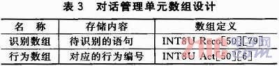 為了方便進(jìn)行對話的管理,本文中設(shè)計了一個對話管理單元,用于對等待識別的語句和等待執(zhí)行的命令進(jìn)行存儲,在主控制器中通過定義二維數(shù)組來實(shí)現(xiàn)。LD3320每次識別最多可以設(shè)置50項候選識別句,每個識別句可以是單字、詞組或短句,長度為不超過10個漢字或者79個字節(jié)的拼音串;谏鲜鲈,本文設(shè)計的對話管理數(shù)組如表3所列。