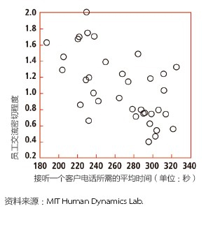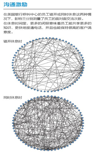 去年,彭特蘭的實(shí)驗(yàn)室與美國(guó)銀行(Bank of America)設(shè)在羅得島(Rhode Island)的呼叫中心合作,在80 名中心員工身上安裝了社會(huì)傳感器。這種傳感器看起來像一枚不顯眼的徽章,使用藍(lán)牙和紅外信號(hào)監(jiān)測(cè)實(shí)驗(yàn)對(duì)象每分鐘與哪些同事交談。測(cè)試活動(dòng)先開展了一個(gè)月,后來又進(jìn)行了6周。第一個(gè)月后,實(shí)驗(yàn)室的研究人員發(fā)現(xiàn),與更多同事進(jìn)行過交談的員工能夠更快地接通電話,他們自我感覺的壓力也相對(duì)較小,而客戶滿意度卻與其他人一樣高。與刻板地遵循員工手冊(cè)或服從經(jīng)理的電子郵件指示相比,通過非正式的閑聊來交流問題和解決方案似乎能取得更好的結(jié)果。有了這種結(jié)論之后,該呼叫中心嘗試盡量將員工的休息時(shí)間安排在一起,而非像過去那樣錯(cuò)開。這樣員工就有了更多的時(shí)間參與閑聊。幾個(gè)月后,美國(guó)銀行向?qū)嶒?yàn)室報(bào)告了結(jié)果:該呼叫中心獲得了相當(dāng)于每年1,500 萬美元的生產(chǎn)力提升。