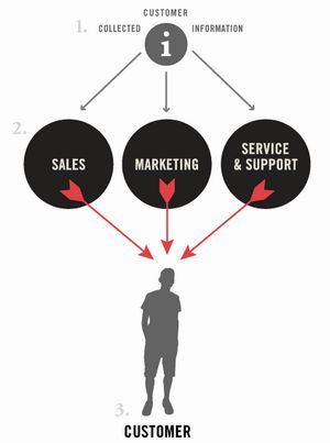 傳統(tǒng)CRM是將公司搜集到的消費者有關信息輸入到CRM系統(tǒng)中,通過銷售、市場推廣以及產(chǎn)品服務等措施,借此有可能獲得更多的潛在目標消費者。
