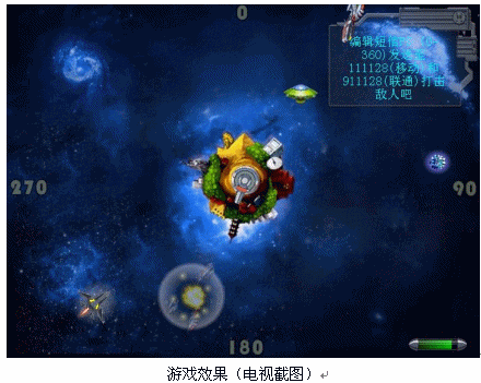 用戶根據(jù)游戲規(guī)則通過固定電話、小靈通和手機(jī)參與《地球保衛(wèi)戰(zhàn)》游戲,就能在短信、語(yǔ)音和電視畫面提示下完成游戲,觀眾通過電視就可以看到火爆的游戲畫面,仿佛如身臨其境;又可以通過參與游戲獲得積分,贏取大獎(jiǎng)。