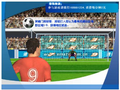 《單挑足球射門II》是我公司根據(jù)世界杯的一些特點(diǎn)、特色重新開發(fā)的一款實(shí)時(shí)游戲。由電視臺(tái)、網(wǎng)站與電信運(yùn)營商聯(lián)合經(jīng)營的電信增值業(yè)務(wù),由電視臺(tái)提供頻道向電視觀眾播出游戲畫面(含圖像和聲音),電信運(yùn)營商提供電話線路和短信通道,參與者通過固定電話、小靈通和手機(jī)參與游戲,運(yùn)營方通過收取固定電話、小靈通和手機(jī)的信息費(fèi)實(shí)現(xiàn)盈利。