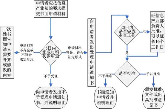信息產業(yè)部或者省、自治區(qū)、直轄市通信管理局應當自發(fā)出受理申請通知書之日起20個工作日內完成審查工作,作出批準或不予批準的決定。20個工作日內不能做出決定的,經信息產業(yè)部或者省、自治區(qū)、直轄市通信管理局負責人批準,可以延長10個工作日,并將延長期限的理由告知申請人。予以批準的,出具正式批準文件;不予批準的,書面通知申請人并說明理由。