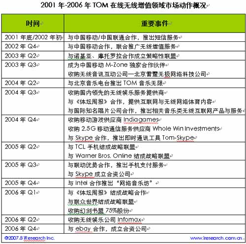 2000年中,TOM在線正式推出,這家一開始便以無線增值為特色的企業(yè)符合了當時中國互聯(lián)網市場的環(huán)境,那時無線增值業(yè)務如火如荼,第五媒體的概念呼之欲出。隨后,便開始了與各大無線媒體、傳統(tǒng)媒體等一系列的合作和收購,所涉及的領域涵蓋短信、無線音樂、手機游戲、手機支付、手機體育新聞、即時通訊等許多行業(yè),一個龐大的無線媒體帝國看似已經牢不可破。直到,2006年第四季度與ebay易趣合并,開始涉足電子商務。