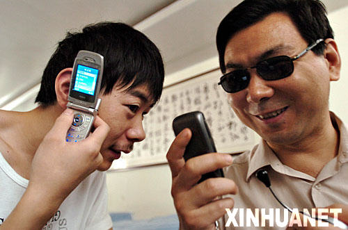 兩位盲人在用盲人專(zhuān)用手機(jī)收發(fā)短信