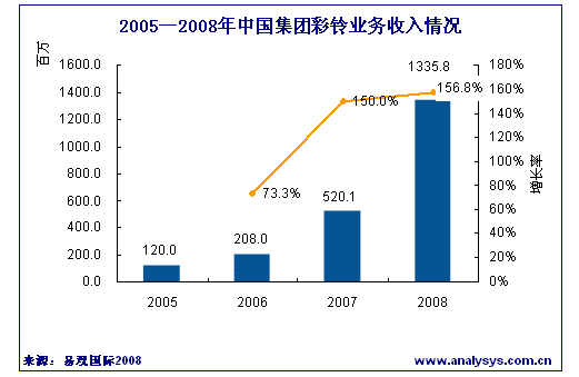 中國集團(tuán)彩鈴業(yè)務(wù)2008年市場(chǎng)收益將達(dá)13.6億元