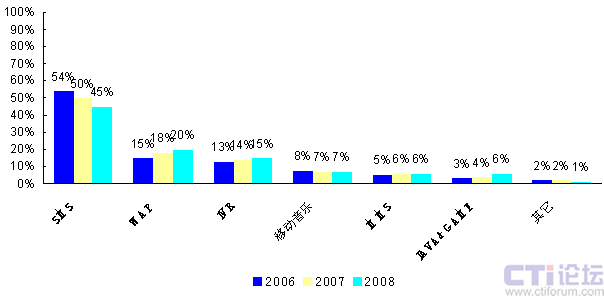 圖1 2006~2008年中國移動數(shù)據(jù)業(yè)務(wù)市場結(jié)構(gòu)(單位:%)