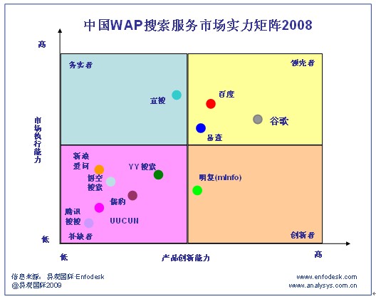 2008年WAP搜索實力矩陣中的創(chuàng)新者為明復,明復在多個領域推廣移動搜索業(yè)務,如攜手SIC共建國家商務數據中心,首推無線名址服務,另外還推出尋親移動搜索,奧運手機搜索等。特別地,明復通過和產業(yè)鏈各環(huán)節(jié)的積極合作以及產品及服務的大力推廣,奠定了一定的品牌知名度和用戶認知度。