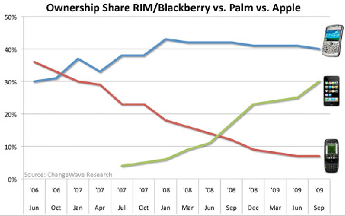 ChangeWave Research今年9月對(duì)4255名美國(guó)用戶進(jìn)行的調(diào)查顯示,其中39%擁有智能手機(jī),高于7月的37%,較去年同期幾乎翻番。雖然RIM黑莓仍然占據(jù)榜首,但是其市場(chǎng)份額增長(zhǎng)已經(jīng)開始停滯,目前約為40%,與去年同期基本持平,而iPhone則保持了快速上升勢(shì)頭,由去年同期的不足20%,增長(zhǎng)到現(xiàn)在的30%。