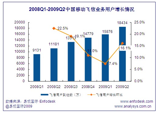 截至2009年第2季度,中國(guó)移動(dòng)飛信用戶(hù)到達(dá)數(shù)達(dá)1.84億,環(huán)比增長(zhǎng)16.1%,與2008年第2季度的1.12億用戶(hù)到達(dá)數(shù)相比同比增長(zhǎng)64.9%,可見(jiàn)飛信用戶(hù)規(guī)模增長(zhǎng)的速度十分迅速,究其原因一方面在于飛信運(yùn)營(yíng)商不遺余力的多渠道營(yíng)銷(xiāo)宣傳,另一方面在于飛信用戶(hù)的口碑傳播,由于用戶(hù)規(guī)模的增長(zhǎng)帶來(lái)更多用戶(hù)嘗試體驗(yàn)飛信業(yè)務(wù)。