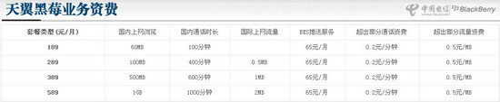 目前電信推出的黑莓手機(jī)套餐分為四類,一類為天翼黑莓簡(jiǎn)裝版,價(jià)格為每月189元,包括60MB國(guó)內(nèi)上網(wǎng)流量,100分鐘國(guó)內(nèi)語音通話時(shí)長(zhǎng);第二類是天翼黑莓標(biāo)準(zhǔn)版套餐,價(jià)格為289元,包括100MB國(guó)內(nèi)上網(wǎng)流量,0.5MB國(guó)際上網(wǎng)流量,400分鐘國(guó)內(nèi)語音通話時(shí)長(zhǎng);第三類和第四類為天翼尊享版套餐包括389元和589元兩種資費(fèi),前者包括500MB國(guó)內(nèi)上網(wǎng)流量,1MB國(guó)際上網(wǎng)流量,600分鐘國(guó)內(nèi)語音通話時(shí)長(zhǎng);后者包括1GB國(guó)內(nèi)上網(wǎng)流量,2MB國(guó)際上網(wǎng)流量,1000分鐘國(guó)內(nèi)語音通話時(shí)長(zhǎng)。