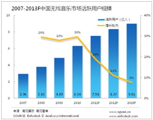 2011年整體無線音樂市場格局仍會(huì)保持相對(duì)穩(wěn)定。但整體市場規(guī)模,及無線音樂用戶數(shù)的增速會(huì)略有下降。易觀國際(Analysys International)預(yù)計(jì)2013年收入規(guī)模達(dá)到400個(gè)億,2013年無線音樂活躍用戶達(dá)到9.95億人。
