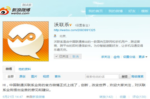 昨日下午,中國聯(lián)通“沃聯(lián)系”業(yè)務(wù)官方微博正式上線,而在稍后晚間,中國聯(lián)通官方微博也對此微博進(jìn)行推介,并稱“中國聯(lián)通即將推出一款面向互聯(lián)網(wǎng)和手機(jī)用戶,跨運(yùn)營商、跨平臺的即時通信軟件‘沃聯(lián)系’。為幫助用戶朋友更好了解和使用這款即將上線的產(chǎn)品,中國聯(lián)通沃聯(lián)系產(chǎn)品組現(xiàn)已開通@沃聯(lián)系新浪官方微博,敬請關(guān)注!