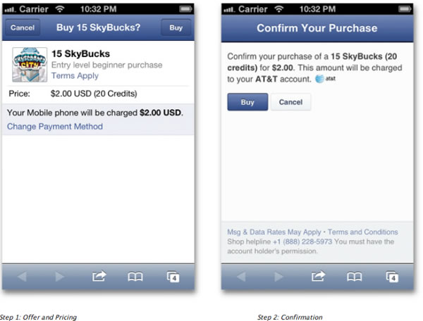 現(xiàn)在,針對應(yīng)用內(nèi)支付,F(xiàn)acebook聯(lián)合移動運(yùn)營商推出了便捷的支付服務(wù),允許用戶在購買Facebook應(yīng)用開發(fā)商所提供的服務(wù)、游戲或者升級服務(wù)時,直接將交易費(fèi)記到電話賬單當(dāng)中。整個流程被簡化成2步:首先用戶選擇需要購買的服務(wù),然后打開支付窗口,點(diǎn)擊確認(rèn)即可。