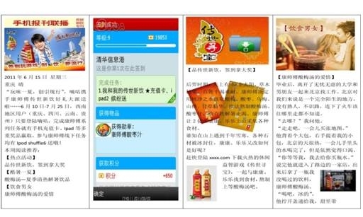 作為快消業(yè)的巨頭,康師傅一直不遺余力地探索新型營(yíng)銷方式,旨在拋棄以往單向、刻板的傳播思路,帶給消費(fèi)者全新的品牌體驗(yàn),“傳世新飲”作為康師傅創(chuàng)新?tīng)I(yíng)銷方式代表者,定位于中華傳統(tǒng)飲品,希望把中國(guó)傳統(tǒng)飲料發(fā)揚(yáng)光大,所以其理想的消費(fèi)群體是20—29歲地年輕人群,而手機(jī)是這部分人接收信息、互動(dòng)娛樂(lè)的重要渠道,開展移動(dòng)營(yíng)銷也是據(jù)此作出的選擇。在與國(guó)內(nèi)領(lǐng)先的全方案移動(dòng)營(yíng)銷服務(wù)提供商百分通聯(lián)的合作中,康師傅一改單純的促銷形式,選擇了近來(lái)深受學(xué)生歡迎的手機(jī)位置化簽到和APP互動(dòng)小游戲進(jìn)行整合,并打通了微博、論壇、彩信手機(jī)報(bào)刊廣告、彩信等進(jìn)行立體化傳播,從而發(fā)揮出驚人的傳播能力。