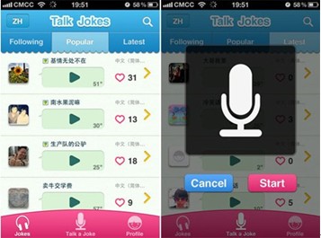 Talk Jokes是一款輕量級語音笑話分享應(yīng)用,鼓勵(lì)用戶通過真人錄音的方式上傳和分享自己的笑話,專注于“講笑話”的這部分語音垂直市場。