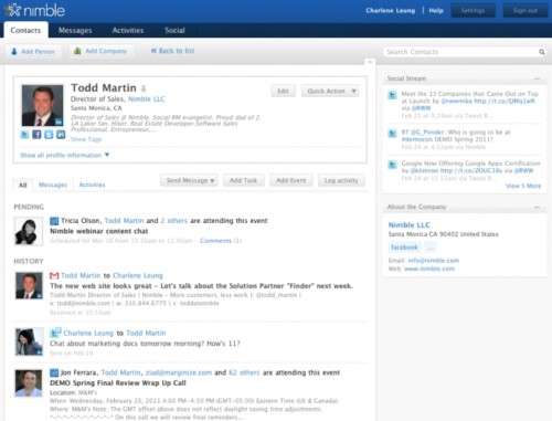 在一切皆可社會化的今天,客戶關(guān)系管理(CRM)服務的社交色彩也開始變得越來越濃。該領(lǐng)域內(nèi)的創(chuàng)業(yè)公司Nimble最近升級了它們的服務,升級后的Nimble 2.0版更加強調(diào)社交信息的聚合管理,試圖給側(cè)重“信息輸入”的CRM服務領(lǐng)域帶來新變化。