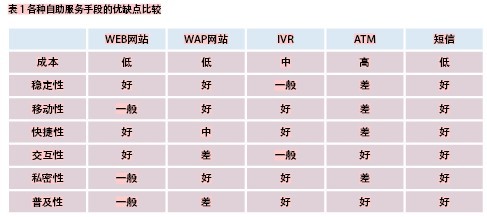 隨著電子化技術(shù)和互聯(lián)網(wǎng)技術(shù)的發(fā)展和普及,各家運(yùn)營商都開始推出各種自助化手段分流人工服務(wù)壓力,改善用戶滿意度。主要的電子化自助手段有WEB網(wǎng)站、WAP網(wǎng)站、IVR語音交互應(yīng)答、ATM自動柜員機(jī)。每種自助袷侄味加釁涓髯緣撓湃鋇恪?lt;br />