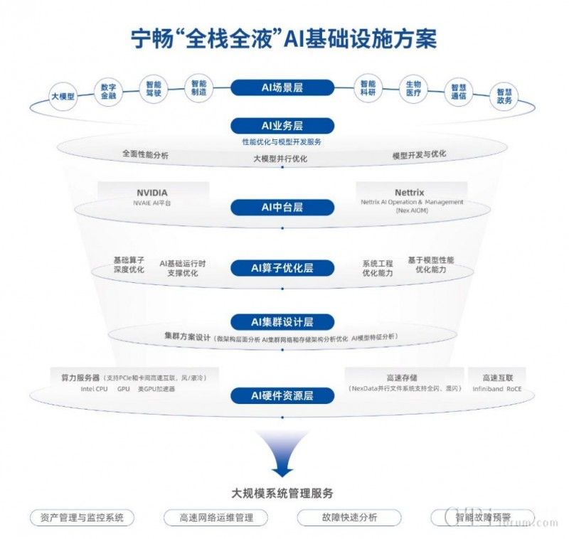 為此,寧暢構(gòu)建了以底層硬件到頂層應(yīng)用平臺(tái)的全棧AI系統(tǒng)環(huán)境。軟件層上以AI算子全棧優(yōu)化能力,為AI 業(yè)務(wù)提供并行加速、性能分析、模型開(kāi)發(fā)優(yōu)化等服務(wù)支持,幫助用戶極速推進(jìn)AI應(yīng)用開(kāi)發(fā)及管理;硬件層上實(shí)現(xiàn)GPU服務(wù)器與GPU卡的靈活組合,散熱方式上可選液冷、風(fēng)冷或風(fēng)液混合,實(shí)現(xiàn)性能與能效的絕佳平衡。寧暢近期推出的業(yè)內(nèi)首個(gè)實(shí)現(xiàn)原生全液冷的通用機(jī)架服務(wù)器,從原生全液冷、大解耦、高能效三方面發(fā)力,助力數(shù)據(jù)中心實(shí)現(xiàn)了“全棧全液”新生態(tài)。
