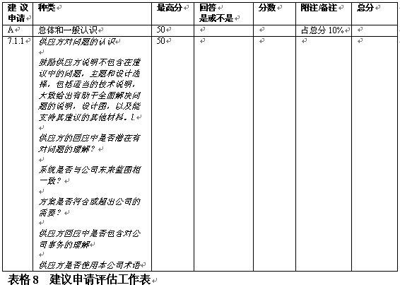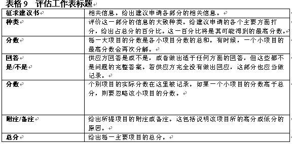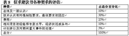 。。在決定了初步要求之后,評(píng)估小組應(yīng)具體地開(kāi)展評(píng)估工作。具體評(píng)估的目標(biāo)是通過(guò)給建議書主要方面打分作出評(píng)估?梢栽谒愠鼋ㄗh書各方面占總分?jǐn)?shù)的百分比,如表8中對(duì)各方面的總覽。一般在建議書內(nèi)向提供者給出這一信息。