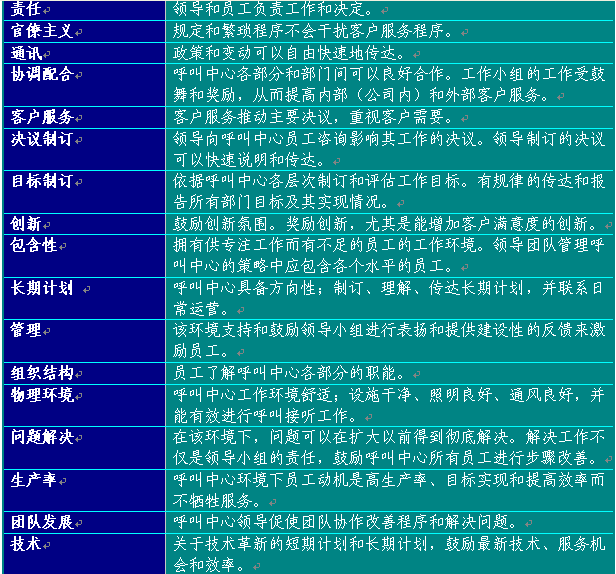 根據(jù)呼叫中心的具體需要,還可以包括許多其他要素。建議在制訂員工滿意度調查表時結合組織人員關系,組織管理、收集和報告結果和趨勢。這有助于員工確信調查過程、調查結果及其對今后提高的影響。