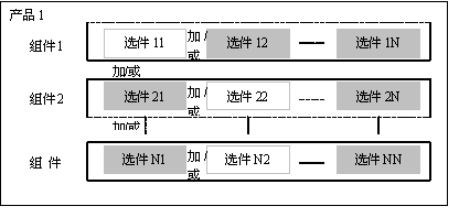 產(chǎn)品是由多個(gè)組件組成的,而組件則由多個(gè)選件組成。組件可以是有形的(如電腦硬盤(pán))也可以是無(wú)形的(如保修期),產(chǎn)品,組件與選件的關(guān)系可以由圖6、2、2來(lái)說(shuō)明。