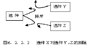 選件的排除關(guān)系是指在產(chǎn)品配置時(shí),選擇了一件就不能選擇另外一件或多件。比如在旅行社在組團(tuán)時(shí)規(guī)定,如選擇了酒店A,就無(wú)法選擇組件交通工具中的選件火車(chē),因?yàn)榫频闍離火車(chē)站太遠(yuǎn)。圖6、2、2、2說(shuō)明了這種關(guān)系。