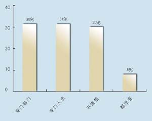 在問(wèn)到實(shí)施周期上,有9家表示希望在3個(gè)月內(nèi)完成,占到47.4%,有6家接受3~6個(gè)月的周期,超過(guò)6個(gè)月的周期已經(jīng)顯得太長(zhǎng)。在問(wèn)到CRM的實(shí)施效果上,有9家認(rèn)為對(duì)公司運(yùn)營(yíng)效率有很大提高,8家認(rèn)為作用一般,只有2家認(rèn)為沒(méi)有作用。表明基本上企業(yè)認(rèn)可CRM的作用。在問(wèn)到是否有專門(mén)人員負(fù)責(zé)CRM時(shí),有6家表示有專門(mén)部門(mén),有6家有專門(mén)人員,合計(jì)占62%,說(shuō)明企業(yè)非常重視CRM的應(yīng)用。