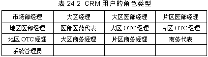 另外,對CRM系統(tǒng)的用戶也進(jìn)行了明確的定義,按照工作性質(zhì),以及本著能夠快速高效地共享信息,提高銷售能力和工作效率的原則,確定表24.2所示的CRM用戶的角色類型。