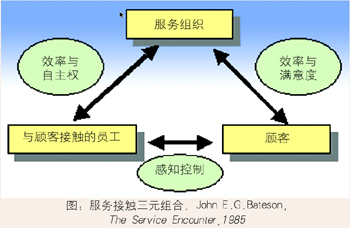 在Bateson的“三元組合”模型中,顧客通過“與顧客接觸的員工”感受到服務提供商提供的服務,從而對服務組織的服務效率和滿意度做出自己的評價。這種情況下,顧客的“滿意”與“不滿”是通過“與顧客接觸的員工”獲得的,但服務感知同時反映了服務組織給予“與顧客接觸的員工”的自主權和“員工的接受程度”。