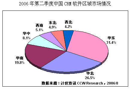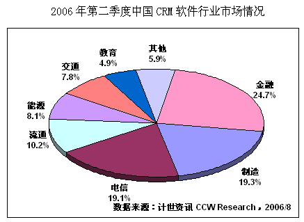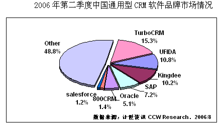 計世資訊(CCW Research)數(shù)據(jù)顯示,2006年二季度中國CRM軟件市場規(guī)模達(dá)2.25億元人民幣,比去年同期增長20.1%,其中通用型CRM軟件市場規(guī)模為0.80億元,占總體CRM市場份額的35.5%。