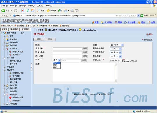 頁(yè)面的最頂端將本系統(tǒng)分為服務(wù)與支持、合同管理、客戶(hù)開(kāi)拓、市場(chǎng)營(yíng)銷(xiāo)、項(xiàng)目管理、銷(xiāo)售管理六板塊進(jìn)行陳列以方便管理,同時(shí)左側(cè)是詳細(xì)的樹(shù)形結(jié)構(gòu)圖,所有功能一目了然。本系統(tǒng)實(shí)現(xiàn)了將不同業(yè)務(wù)、客服人員涉及的客戶(hù)資料進(jìn)行了全面而且條理的整理匯集,整合團(tuán)隊(duì)的力量提供完善的服務(wù)。