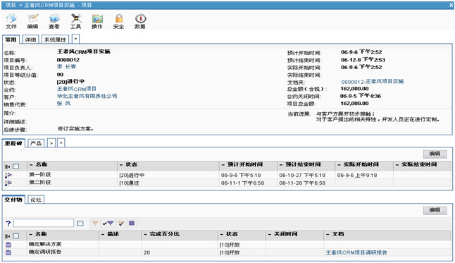VamCRM提供專業(yè)的項目管理模塊,支持項目范圍管理、時間管理、資源管理、質(zhì)量管理、成本管理。支持以銷售合約為驅(qū)動、過程清晰、全程受控的項目管理方式為客戶交付產(chǎn)品和服務。VamCRM融入成熟的項目管理方法和成功的實踐經(jīng)驗,從整體上對項目進行規(guī)劃、組織、執(zhí)行、控制,使企業(yè)可以更加優(yōu)質(zhì)地為客戶提供長期的服務。項目創(chuàng)建后,VamCRM系統(tǒng)會自動生成一個與當前項目相匹配的文件夾,為項目執(zhí)行過程中產(chǎn)生的交付物或項目的有關文檔提供統(tǒng)一的存檔位置;項目全程融合項目管理的方法,分里程碑管理項目活動和交付物,實時統(tǒng)計項目的關鍵數(shù)據(jù),并且里程碑及所屬活動和交付物等都可分狀態(tài)量化標識,對項目進展做到實時監(jiān)控,避免了在項目實施中的“救火”行動和盲目發(fā)展。也可自動關聯(lián)記錄并統(tǒng)計所有項目進展過程中發(fā)生的預算與費用,實現(xiàn)項目費用清晰可控。伴隨著項目的進程,可以記錄所有在項目執(zhí)行過程中相關的聯(lián)系人、文檔、備忘錄等數(shù)據(jù),形成完整的項目內(nèi)容集合。項目中還包括基于項目的論壇,供項目組成員就項目的相關問題進行在線交流,同時,項目管理全程與企業(yè)高效協(xié)同的業(yè)務流程無縫集成,能夠使企業(yè)的相關部門以項目為導向,集中所有資源高效協(xié)同服務,大大降低項目執(zhí)行風險。