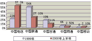通過引入IP電話業(yè)務(wù),我國電信市場已經(jīng)形成了以中國電信、中國聯(lián)通、中國移動、中國吉通和中國網(wǎng)通等五大電信運營公司為主體的新格局。他們各自的業(yè)務(wù)范圍不盡相同,但IP電話是他們相同的業(yè)務(wù)之一,所以這一市場相互之間的競爭較為激烈。圖1和圖2分別表示這五大運營商在2000年上半年IP電話的話務(wù)量和收入。從圖中可以看出,他們在我國IP電話市場上所占據(jù)的地位和角色。
