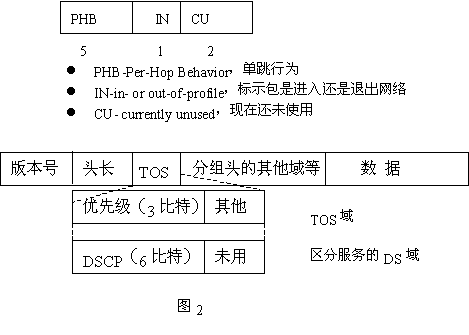 QoS的業(yè)務區(qū)分結構使用IPV4報頭中的業(yè)務類型(TOS)字段,并將8位TOS字段重新命名,作為DS字段,其中6位可供目前使用,其余2位以備將來使用。該字段可以按照預先確定好的規(guī)則加以定義,使下行節(jié)點通過識別這個字段,獲取足夠的信息來處理到達輸入端口的數據包并將他們正確地轉發(fā)給下一跳的路由器。這里需要注意的是在IPV4網中所定義的TOS字段與在Diff-Serv中的DS字段不同。TOS字段的定義如圖2所示。圖IPV4報頭中TOS字段定義Diff-Serv充分考慮了IP網絡本身靈活,可擴展性強的特點,將復雜的服務質量保證通過DS字段轉換為先進的單跳行為,從而大大減少了信令的工作。