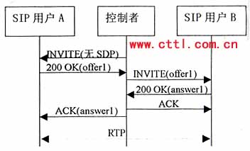 本流程中,控制者向A發(fā)送一個(gè)沒有SDP的INVITE。A應(yīng)答的200 OK響應(yīng)中包含一個(gè)offerl,控制者立即在ACK消息中產(chǎn)生一個(gè)“黑洞”SDP應(yīng)答。