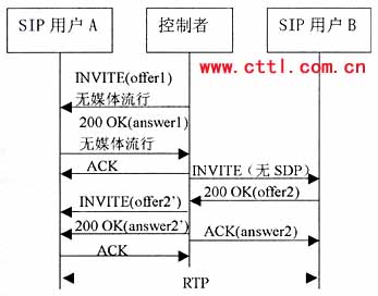 控制者再向B發(fā)送一個(gè)沒有SDP的INVITE。B應(yīng)答的200 0K響應(yīng)中包含一個(gè)提供offer2,控制者應(yīng)該基于offer2向A發(fā)送一個(gè)re-INVITE,注意。offer2可能需要稍作修改來滿足媒體要求。例如如果offer1包含一個(gè)音頻和一個(gè)視頻行,而offer2只有一個(gè)音頻行,控制者就需要在offer2中增加一個(gè)視頻行(端口設(shè)為O)來構(gòu)成offer2’。由于這是一個(gè)re-INVITE,所以通常應(yīng)該能立即收到響應(yīng)。A的200