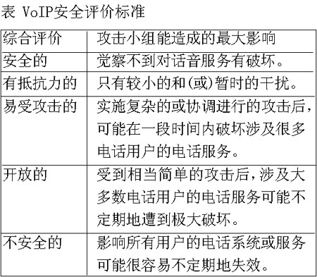 測(cè)試結(jié)果表明,采用了復(fù)雜攻擊手段的攻擊小組無(wú)法破壞思科公司的VoIP網(wǎng)絡(luò),甚至無(wú)法對(duì)其造成顯著的干擾。這套精心制造的IP電話系統(tǒng)(包括第二層和第三層基礎(chǔ)設(shè)施以及各式各樣的附加安全軟件)是“安全的”(參見表中所示的VoIP安全評(píng)價(jià)標(biāo)準(zhǔn)),它最大限度地全面發(fā)揮了思科公司的網(wǎng)絡(luò)安全專長(zhǎng),利用了思科公司擁有的每一種防御武器。