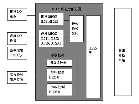 為網(wǎng)絡(luò)電話和可視電話會議系統(tǒng)的進(jìn)一步發(fā)展和系統(tǒng)的兼容性提供了良好的條件。其中系統(tǒng)控制協(xié)議包括H.323、H.245、和H.225.0,Q.931和RTP/RTCP是H.225.0的主要組成部份。系統(tǒng)控制是H.323終端的核心。整個系統(tǒng)控制由H.245控制信道、H.225.0呼叫信令信道和RAS(注冊、許可、狀態(tài))信道提供,音頻編解碼協(xié)議包括G.711協(xié)議(必選)、G.722、G.723.1、G.728、G.729等協(xié)議。編碼器使用的音頻標(biāo)準(zhǔn)必須由H.245協(xié)議協(xié)商確定。H.323終端應(yīng)由對本身所具有的音頻編解碼能力進(jìn)行非對稱操作。如以G.711發(fā)送,以G.729接收。視頻編解碼協(xié)議主要包括H.261協(xié)議(必選)和H.263協(xié)議。H.323系統(tǒng)中視頻功能是可選的。數(shù)據(jù)會議功能也是可選的,其標(biāo)準(zhǔn)是多媒體會議數(shù)據(jù)協(xié)議T.120。其結(jié)構(gòu)如圖所示。