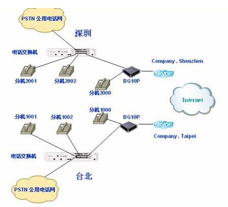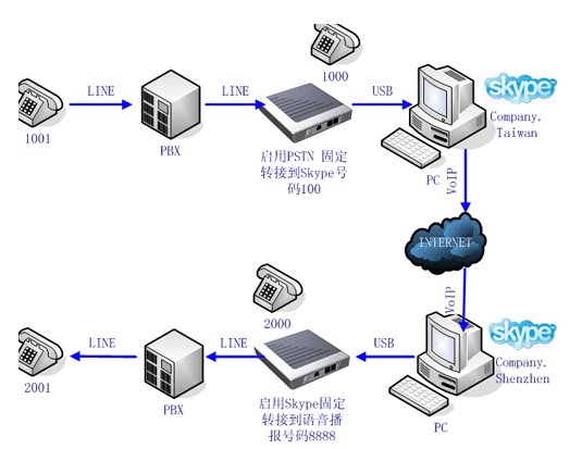 當(dāng)臺(tái)北辦公室的一個(gè)員工(分機(jī) 1001)想與深圳辦公室的一個(gè)員工(分機(jī)2001)通話,他(她)撥打1000號(hào)分機(jī),臺(tái)北側(cè)的ITA將該P(yáng)STN呼叫Forward到深圳的Skype(Company.