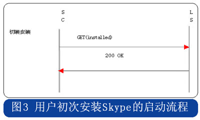 Skype的用戶終端啟動(dòng)時(shí),采用HTTP協(xié)議連接到注冊服務(wù)器,用戶初次安裝的啟動(dòng)流程中攜帶“installed”的參數(shù),使用時(shí)啟動(dòng)流程則在消息中攜帶“getlatestversion”參數(shù),具體流程分別見圖3和圖4。
