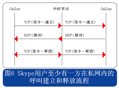 從上述流程圖可見,Skype的呼叫信令都采用TCP封裝,而媒體流則使用UDP封裝,當(dāng)有任何一方用戶位于限制UDP包的防火墻內(nèi)時(shí),媒體流就會(huì)采用TCP封裝。另外當(dāng)Skype用戶至少有一方位于私網(wǎng)內(nèi)時(shí),所有的信令和媒體消息都經(jīng)過一個(gè)或多個(gè)中間節(jié)點(diǎn)轉(zhuǎn)發(fā)。此時(shí)無需擔(dān)心用戶通話的媒體流因?yàn)榻?jīng)過中間節(jié)點(diǎn)轉(zhuǎn)發(fā)而被竊聽,因?yàn)镾kype采用了對消息進(jìn)行端到端加密的機(jī)制。
