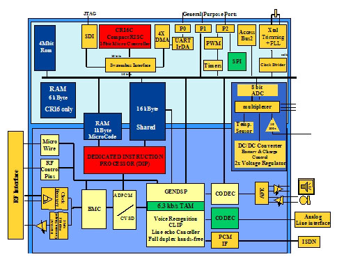 例如,SC14438是一個優(yōu)化了的CMOS芯片,能夠進行DECT(1.9GHz)內(nèi)或2.4GHz ISM數(shù)字頻帶手機內(nèi)需要的所有音頻、信號及數(shù)據(jù)處理。一個ADPCM代碼轉(zhuǎn)換器,一個低功耗的編解碼器(CODEC)及模擬前端被集成于該芯片中,提供麥克風與(動態(tài)的)揚聲器之間直接的連接。同時還整合了雙工免提操作。SC14438的設(shè)計適用于任一無線產(chǎn)品設(shè)計。一個專用的TDMA控制器能夠處理所有的物理層時隙和無線控制。美國國家半導(dǎo)體公司的標準小型RISC