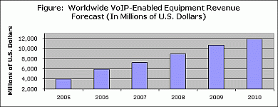 2006年11月?lián)y(tǒng)計(jì),全球VoIP設(shè)備銷(xiāo)售收入將從2005年的39.5億美元增長(zhǎng)到2010年的119億美元,年度復(fù)合增長(zhǎng)率為24.7%。如下圖所示。VoIP市場(chǎng)主要包括三個(gè)用戶群:用于企業(yè)的專用電話交換機(jī)(PBX),服務(wù)供應(yīng)商的基礎(chǔ)架構(gòu)以及住宅接入設(shè)備。