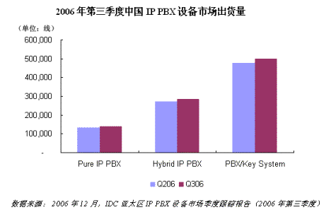 根據(jù)《IDC亞太區(qū)IP PBX市場(chǎng)季度跟蹤報(bào)告(2006年第三季度)》中國(guó)部分?jǐn)?shù)據(jù)顯示,2006年第三季度中國(guó)PBX系統(tǒng)出貨量接近100萬(wàn)線(xiàn),其中純IP PBX占到15.1%,混合PBX占到30.9%,傳統(tǒng)PBX占到54%。