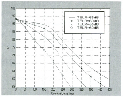 其中,Nc表示電路引起的所有哚聲功率之和,Nos表示發(fā)送端背景噪聲引起的電路噪聲,Nor表示接收端背景噪聲引起的電路噪聲,Nfo表示接收端的噪聲。影響Ro的主要因素包括:響度評測值(SLR,RLR),背景噪聲(Ps,Pr),電話延遲值(Ds,Dr),說話者回音響度額定值(TELR)。
