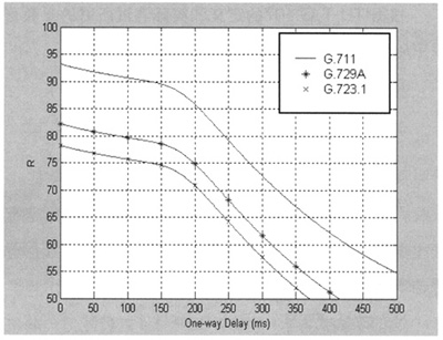 。1)延時(delay),指IP包從網(wǎng)絡(luò)入口點到達網(wǎng)絡(luò)出口點所需要的傳輸時間。如果在一個呼叫中包含不同的通路時間,則存在抖動,抖動越大則語音質(zhì)量下降的越明顯。在E模型中采用固定緩沖區(qū)的方法,可以使抖動的影響轉(zhuǎn)化為延時[7]。