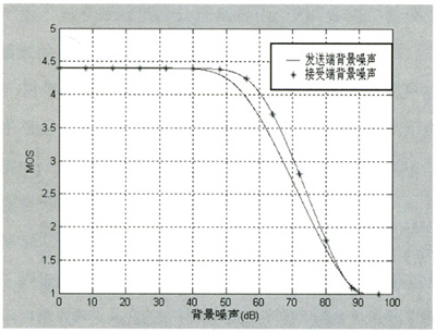 (3)從圖4仿真結(jié)果可以看出,發(fā)送端背景噪聲Ps和接收端背景噪聲Pr對MOS值的影響:背景噪聲小于40 dB時,對語音質(zhì)量沒有太大的影響,當背景噪聲大于40