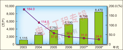 圖3:2003-2006年中國(guó)大陸寬帶用戶數(shù)量增長(zhǎng)及2007-2008年預(yù)測(cè)。